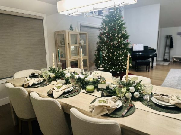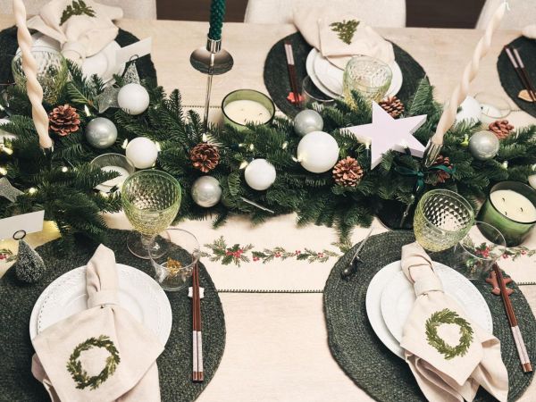 细节在此刻被无限放大:雪松与麋鹿造型的名卡架,让每位客人都成为这场仪式中独一1无二的角色;亚麻餐巾被精心折叠,上面绣有圣诞花环,搭配着白色的陶瓷餐巾扣;时下流行的ICHWNDORF节日玻璃杯,姜饼和松树都是应季的点缀,还有唯宝的复古酒杯,也是美轮美奂,而且,这些餐具都能进洗碗机,这也是快节奏生活的必备要求;餐桌中央,银色烛台高低错落,与青松、松果构成自然主义的中心装饰。而这一切的“氛围灵魂”,无疑是客厅那棵三米高、刚从山上砍回来的诺贝尔松树。它蓬勃的生命力与清冽的松香,充盈着整个空间,将山野的自然气息直接引入室内。