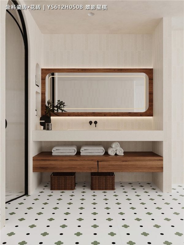 将花砖通铺于湿区地面,搭配原木元素、白色洁具和绿植