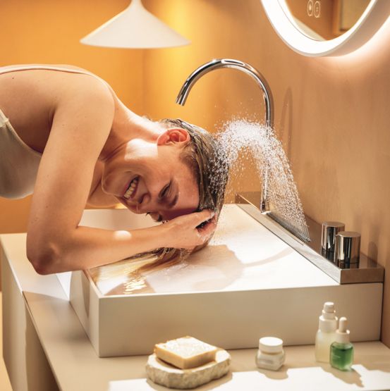 Avalegra爱俐偲集成盥洗系统配备优雅的鹅颈式面盆龙头,单股式出水模式带来晶莹剔透的潺潺水流,让洗漱成为视觉与触觉的双重享受。同时,龙头纤细的出水嘴可实现50°旋转角度调节,让日常用水体验尽可能的自然、舒适和愉悦。