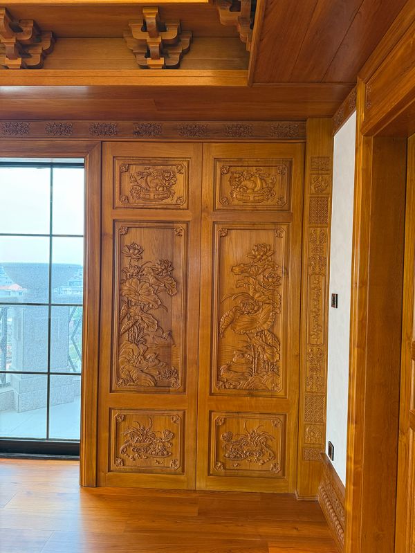 较于大厅的大气,卧室的木作更偏向细腻 —— 门扇的花鸟雕刻、踢脚线的简约雕花、吊顶的线性灯带,都在弱化张扬,强化静谧与舒适,符合卧室的功能属性;大面积玻璃窗与柚木暖色调形成对比,自然光与木作质感交融,让空间通透又不失厚重。