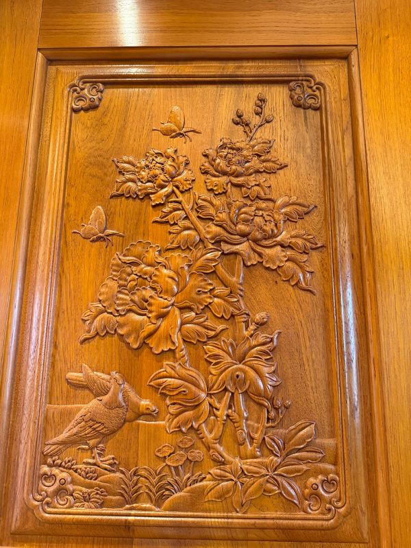 门扇与护墙雕刻:卧室门扇、护墙板以牡丹、莲花、兰草、花鸟等吉祥图案为主题,采用对称式构图,浮雕层次分明 —— 牡丹寓意 “富贵吉祥”,莲花象征 “清廉高洁”,花鸟则传递 “生机盎然”,既蕴含美好期许,又通过细腻刀工让静态木作充满生命力。