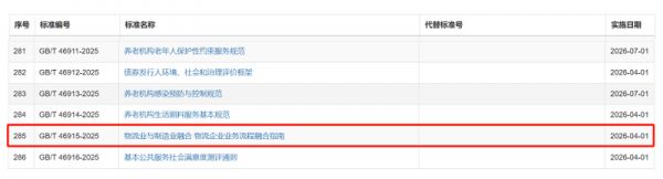 近日,由安得智联深度参与编制的《物流业与制造业融合 物流企业业务流程融合指南》(GB/T 46915-2025,以下简称 “《标准》”)正式发布。据了解,该《标准》由国家标准委主管、全国物流标准化技术委员会归口管理,将于2026年4月1日起正式实施,确立了物流业与制造业融合中物流企业业务流程融合的基本原则,将有利于推动物流企业与制造企业的深度融合,助力实体经济降本增效。