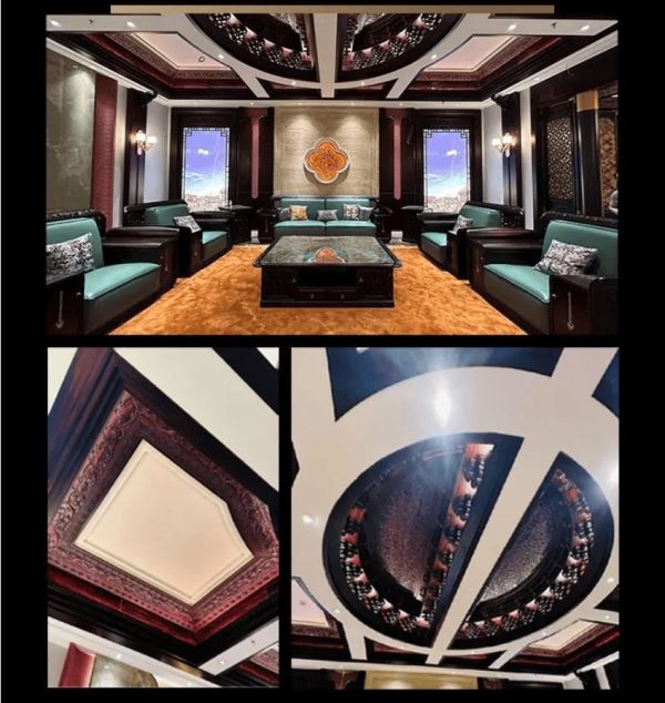 一二级吊顶之间满雕回纹、缠枝牡丹纹