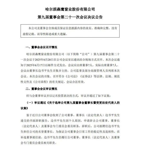 6月22日,森鹰窗业发布公告称,董事会于近日收到公司董事、董事长(法定代表人)边书平提交的书面辞职报告,边书平因个人原因,申请辞去公司董事、董事长(法定代表人)及董事会专门委员会委员职务。