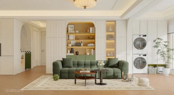 采用拱形门洞搭配曲线造型家具,柔化空间线条,打破方正空间的呆板感,让整体氛围更加优雅柔和。