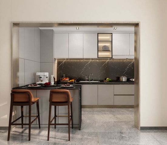 I型厨房,把所有的电器和柜子沿着一面墙放置,适合小户型。双II型厨房,沿着两面相对墙设置两排橱柜,而且需要保障两边橱柜中景能够预留两人同时进出的空间。U型厨房,能够最大限度利用厨房空间,适合厨房面积较大的户型。